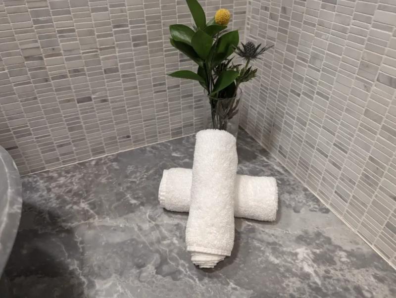 - Spacious room, with a large shower and tub. Separate toilet (with bidet) with a second vanity.